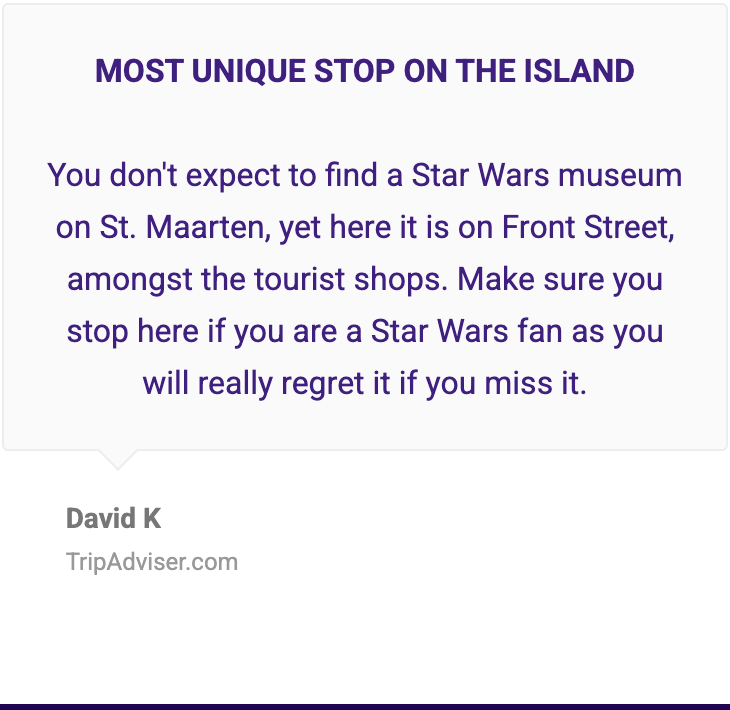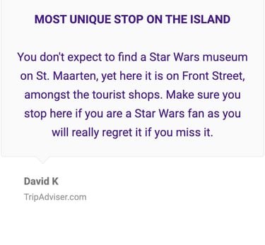 "My wife knows I am a big Star Wars fan and we she surprised me by taking me to this museum, I was so happy. Nick was awesome, we got there right before closing and he still let my Wife and me in and gave us such a great tour about his museum and then he let us wander off. I felt like a kid again seeing all the props from the old Star War movies and other movies as well. Knowing Nick was one of the original Yoda creators was awesome and an honor to meet him. This is definitely a must see when you come to Saint Maarten. I wish more people knew about this amazing place. I definitely would love to come back when I return to Saint Maarten. Thank you for a great experience Nick!"