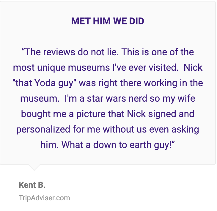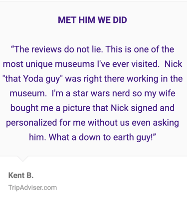 "I was shocked to see the original Yoda from Star Wars! This museum had so many original artifacts from some of the top movies of all time. Nick Maley, himself, was there running the museum and took the time to greet each guest as they arrived and answered questions they had. Any movie buff or fan of Star Wars should make plans to stop in and see the collection. I didn't anticipate much heading into the shop, but was floored by the amount of memorabilia he had from dozens of films he had the privilege to work on. Nick donates your ticket cost to help with medical needs of under privileged individuals."